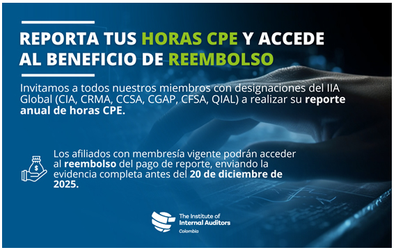 El IIA COLOMBIA mantiene el beneficio por disposición de su Junta Directiva el reembolso del costo de reporte de horas CPE, única y exclusivamente para los miembros con membresía vigente que acrediten el pago y debido reporte de las horas CPE antes del 20 de diciembre de 2025.