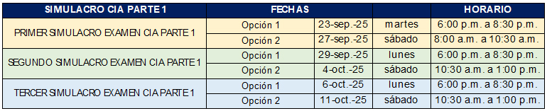 El simulacro de CIA Parte 1, tiene 3 exámenes disponibles, cada uno tendrá dos opciones de fecha para su presentación, cada participante puede escoger la que más se ajuste a su disponibilidad.