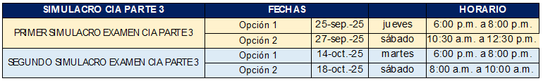 El simulacro de CIA Parte 3, tiene 2 exámenes disponibles, cada uno tendrá dos opciones de fecha para su presentación, cada participante puede escoger la que más se ajuste a su disponibilidad.